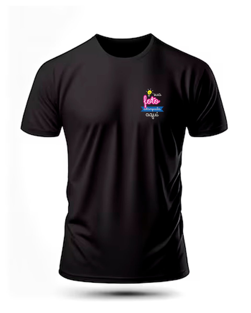 A personalização é feita com impressão DTF (Direct to Film), que proporciona excelente definição, cores intensas e durabilidade mesmo após diversas lavagens. A estampa pode ser aplicada na parte frontal ou traseira da camiseta, com dimensão máxima de 7x7 cm.