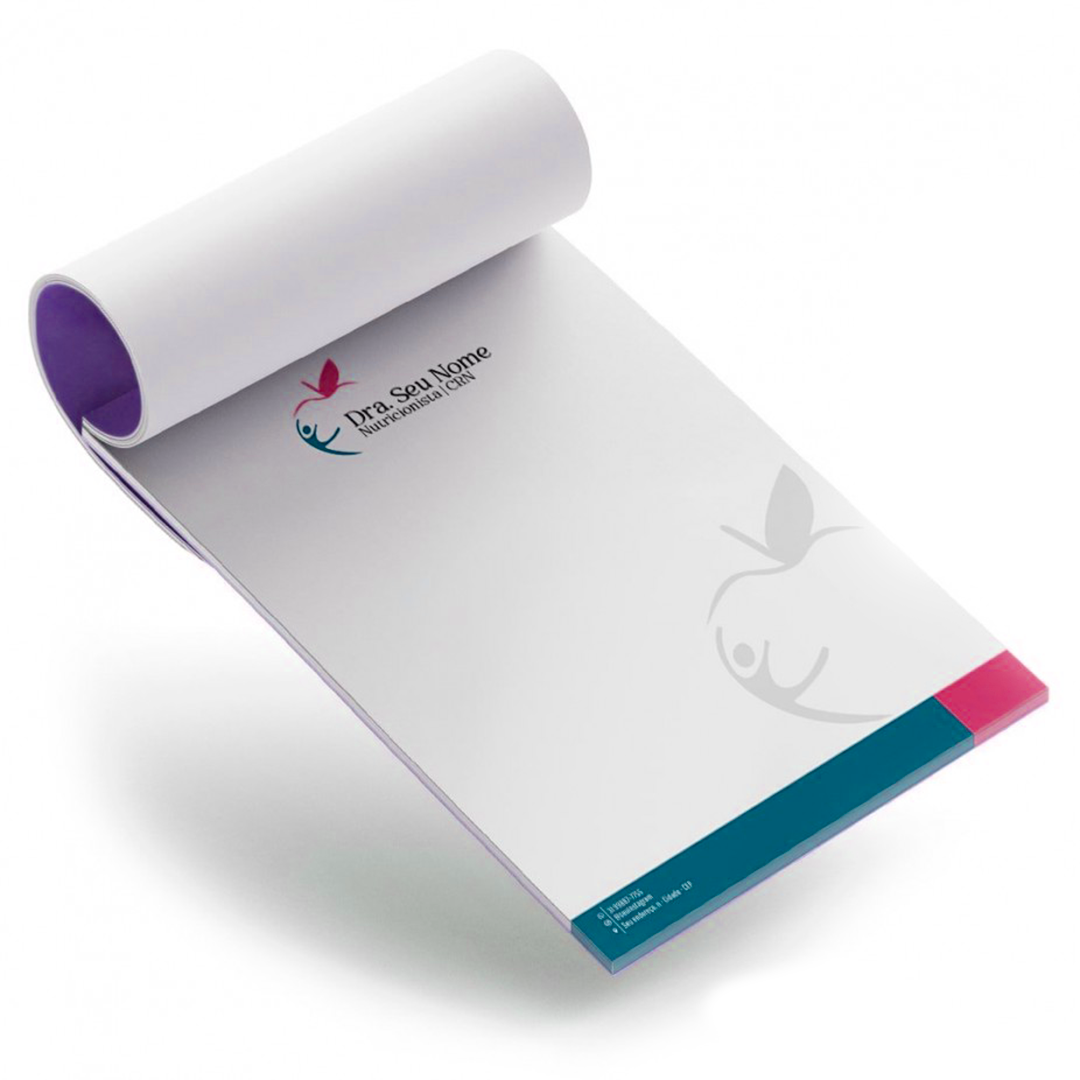 Cada bloco contém 100 folhas coloridas, com acabamento de alta qualidade que garante praticidade no manuseio diário. A impressão é feita apenas na frente, com nitidez e cores vivas que valorizam o logotipo, os dados do profissional e as informações da clínica.