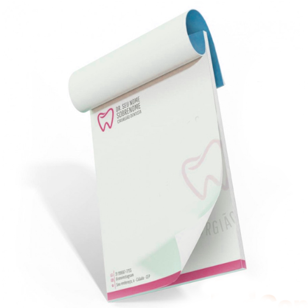 Cada receituário contém 100 folhas coloridas, unidas em blocos com acabamento de qualidade, que facilitam o manuseio e o uso diário. A impressão é feita na frente, com qualidade nítida e cores vivas, destacando o logotipo, dados do profissional e informações da clínica ou consultório.